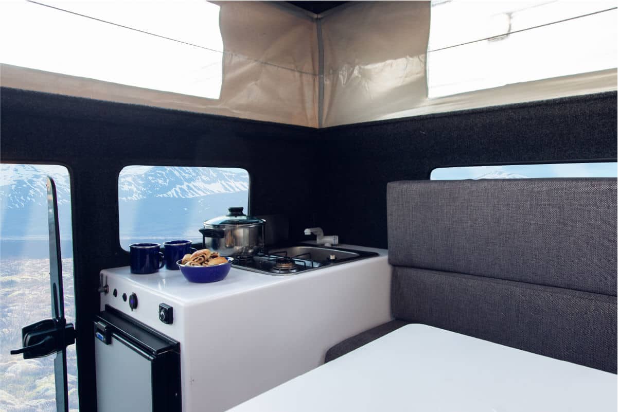 The Toyota Hilux is the perfect option for a highland adventure with the family or a group of friends! The camper house sits on the back of a 4×4 truck, inside the house you will find a well-organized and spacious area. The house has a built-in seating area allowing you to sit and eat inside on rainy days. There is one built-in bed that fits two adults and another bed can be made from the sitting area by re-adjusting the table. In the small kitchen, feel free to cook inside using our essential kitchen supplies and wash dirty dishes in the handy sink. Camp in any weather with the built-in Webasto heating system, or the portable hater. This model has dual electricity, allowing the camper to be plugged into campsite electricity if needed. Charge mobile devices in the camper, using the 12V power included. Take on the highlands with our Toyota Hilux.
