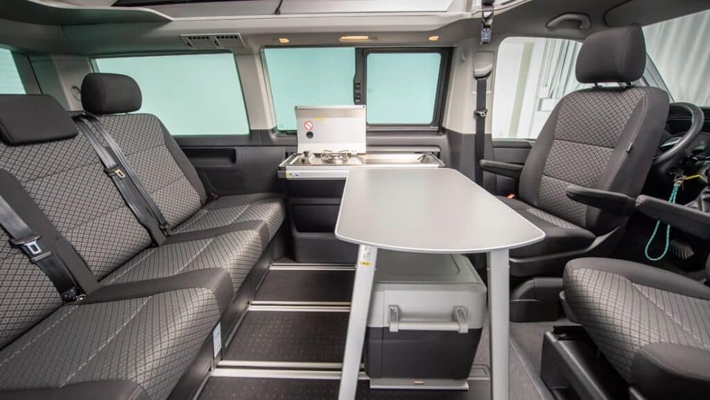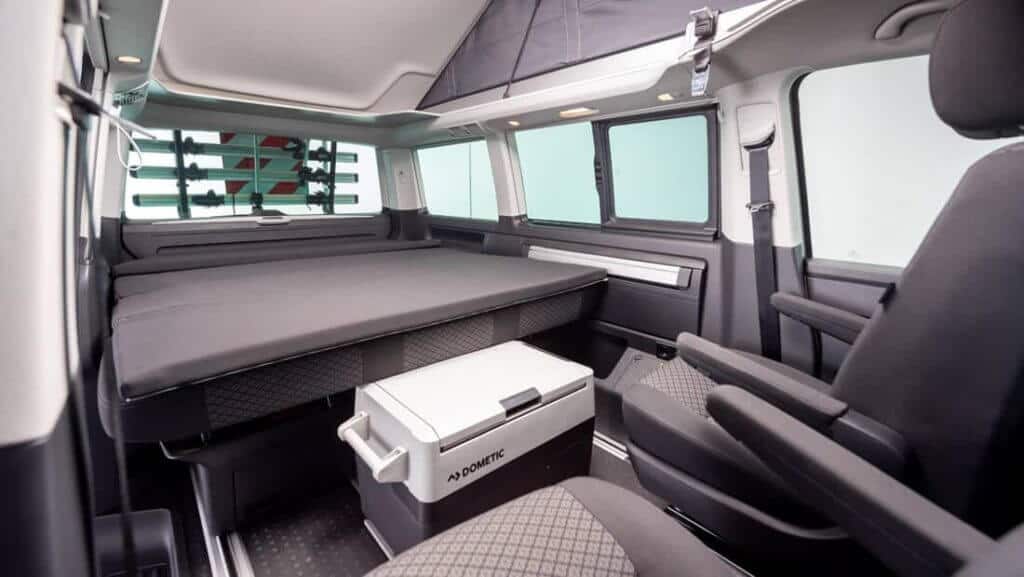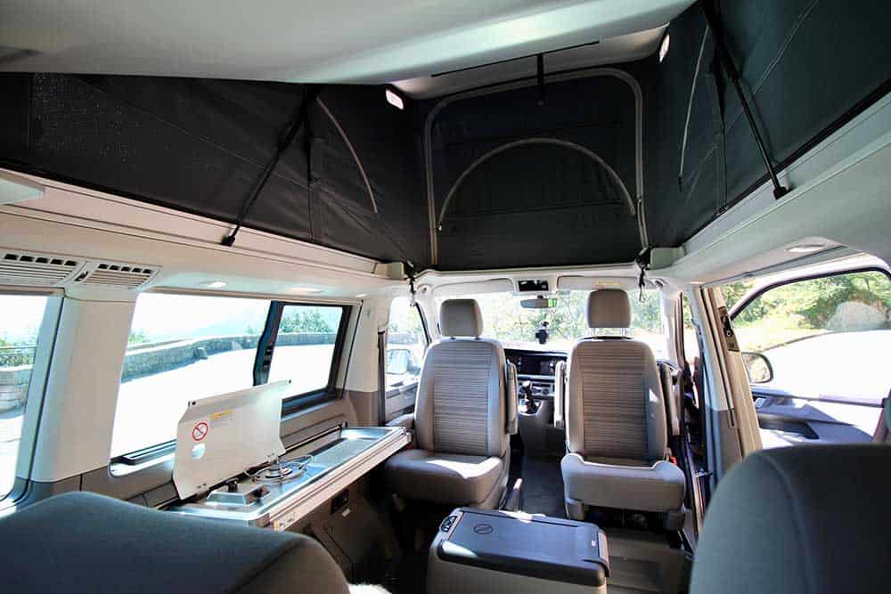 Are you thinking of exploring the highlands? Our brand new VW California is a 4×4 campervan that is fully equipped for four people with any kitchen essentials you might need, bedding, a fridge, a table, and chairs to allow you to eat outside. The California also gives you the option to attach a table inside, giving a comfortable inside seating area. The back seats convert to a full-size bed for two and the hidden pop-up tent allows two more adults to fit. In this new model, there is dual electricity, meaning that you can plug the car in at campsites when in need, or use the 12V power. Charge your battery-powered devices using the 230V plugs or charge mobile devices with the 12V plugs. Inside the VW California, you will find a built-in heating system for cold nights. Take advantage of the 4WD and discover new corners of Iceland. The VW California comes with a full living room setup and everything you might need for a comfortable journey.